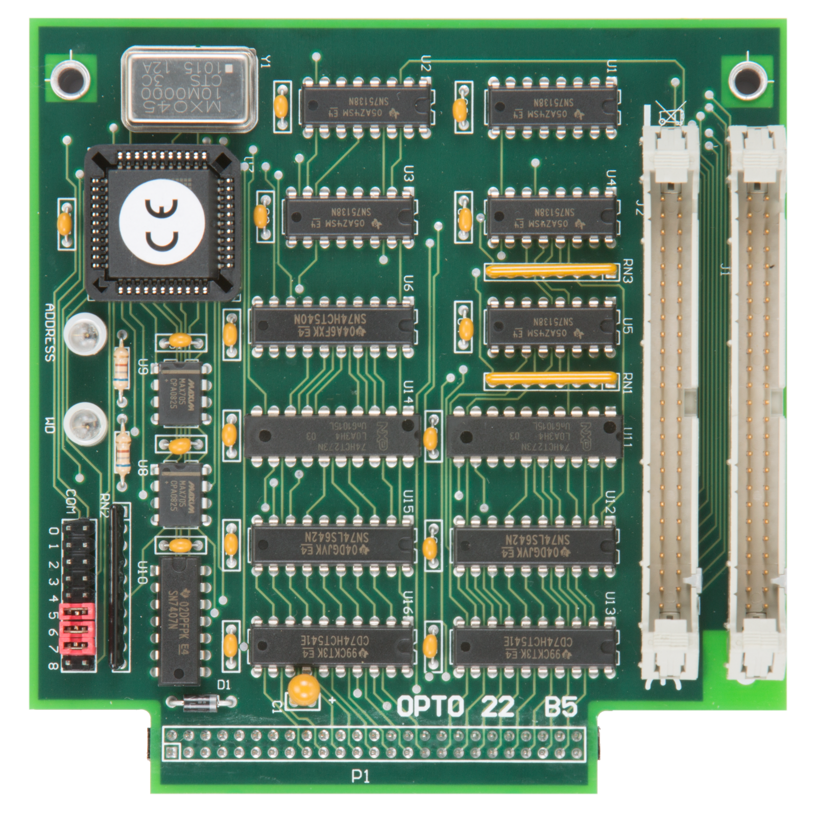 The Pamux B5 is an addressable digital brain board that can control up to 16 input or output points in distributed I/O applications. The B5 is designed for use with a variety of Opto 22 I/O mounting racks, including racks that accept single-point digital I/O or quad pak digital I/O as well as racks with integrated digital I/O circuitry.