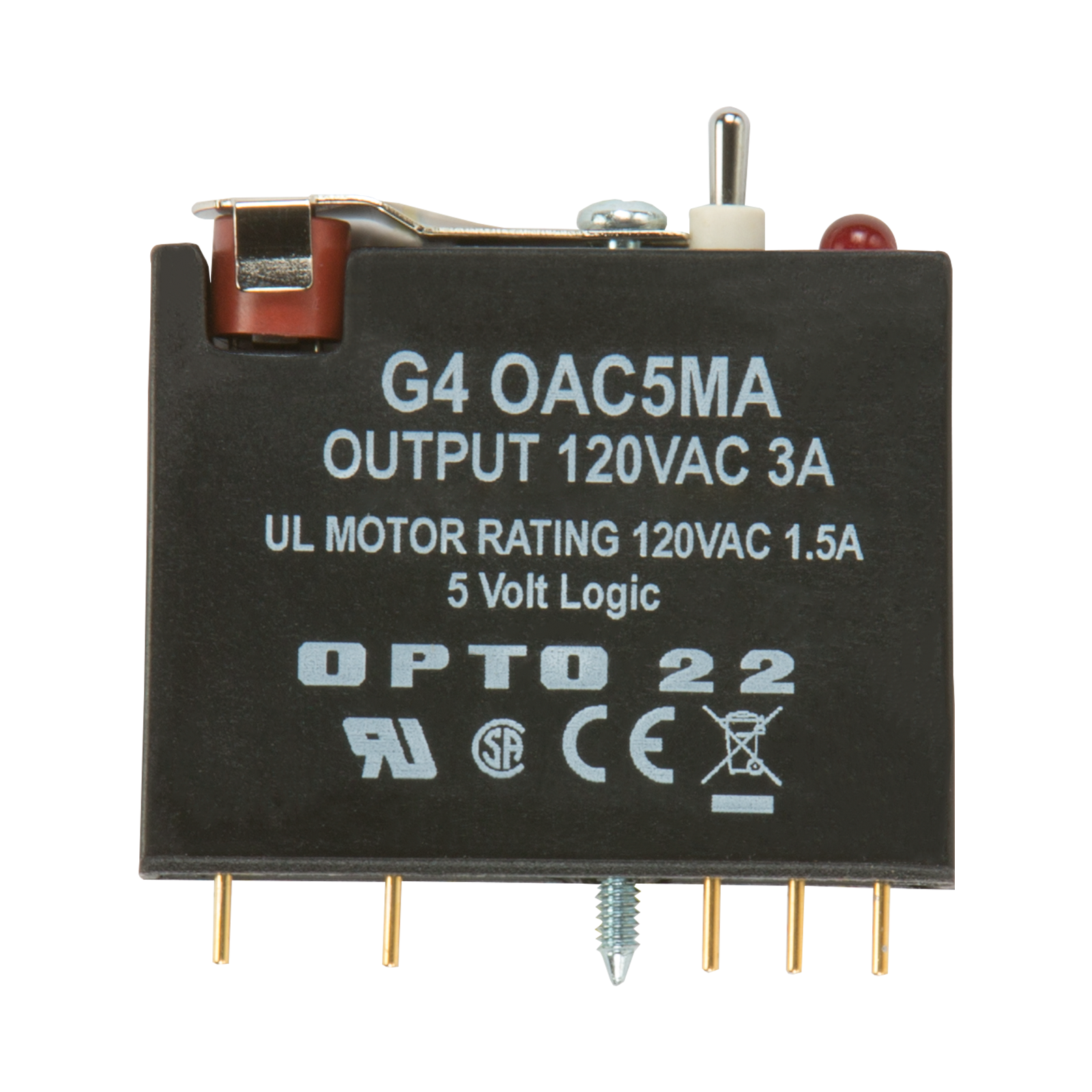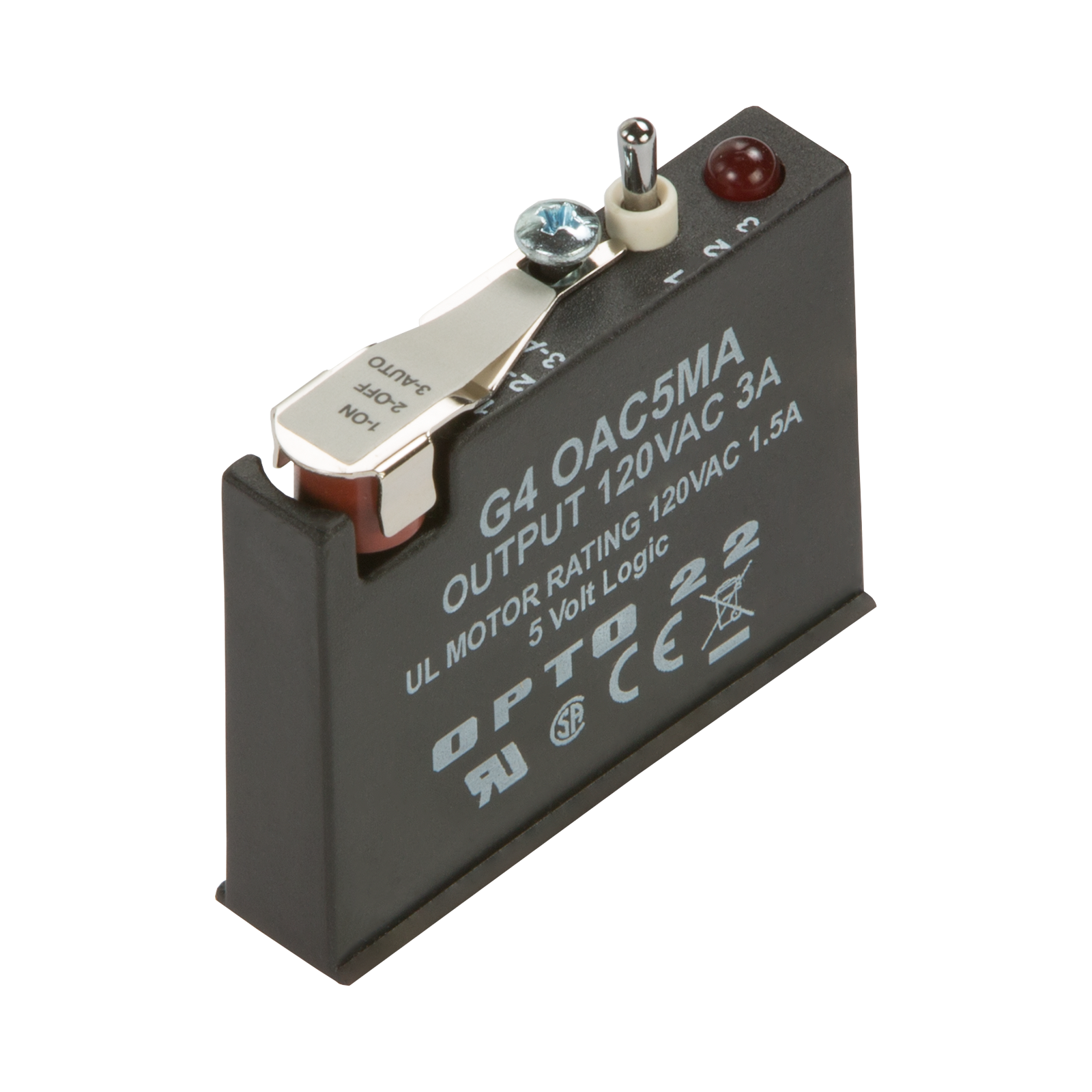 The G4OAC5MA features a manual-on/manual-off/automatic switch, ideal for diagnostic testing of control applications. This AC output module is equivalent to a single-pole, single-throw, normally open contact (Form A, SPST-NO). It includes a 4 amp fast-blow fuse.
