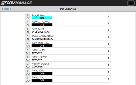 Commissioning and troubleshooting can be done on the spot or remotely, from a computer or mobile device. In groov Manage you can view and change I/O channel status and output values. You can also clear any channel features, like latches, counters, and min/max values.