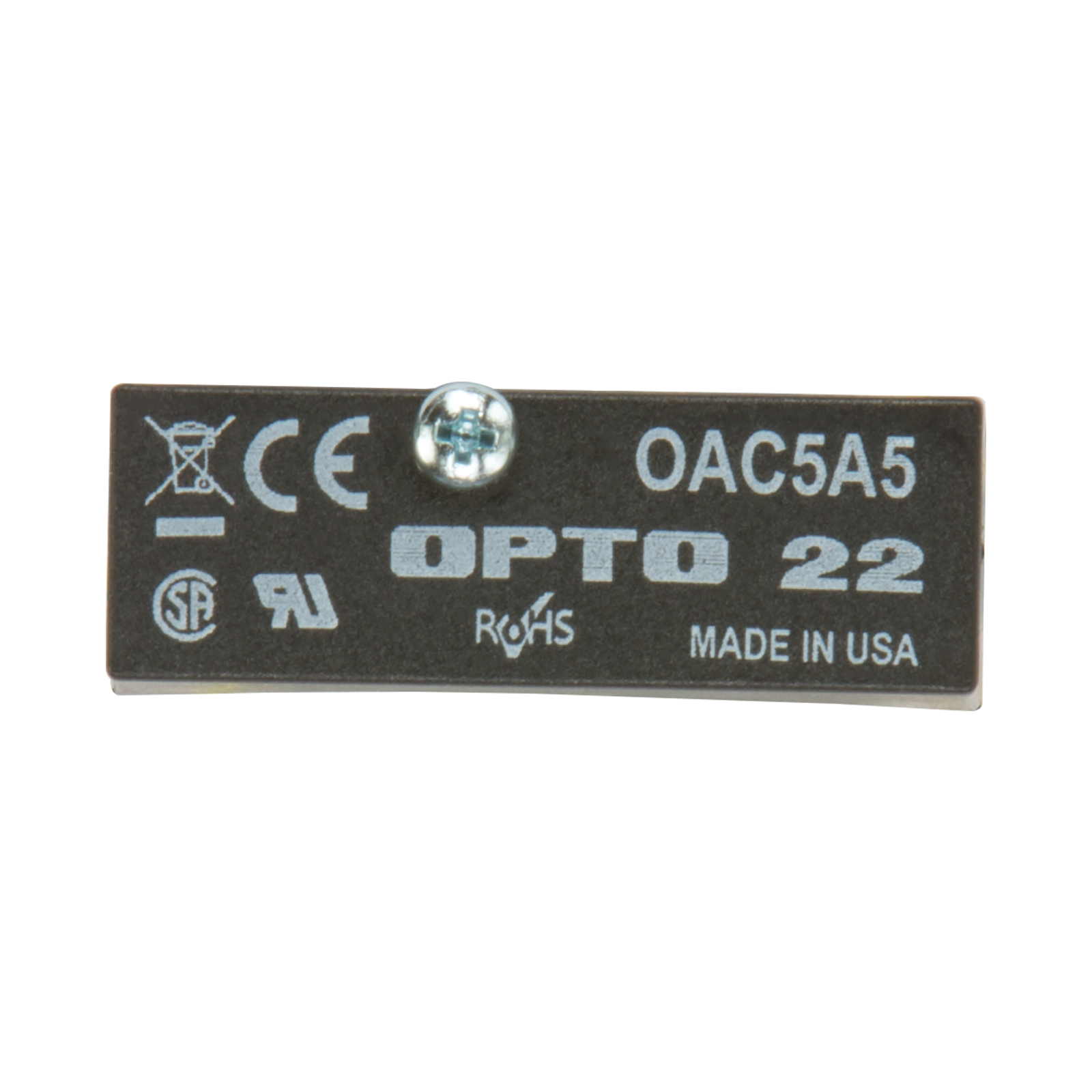 The OAC5A5 output module is used for controlling or switching AC loads of 24-280 VAC. Each module provides up to 4000 volts (transient) of optical isolation between the field devices and the control logic. The OAC5A5 is equivalent to a single pole, single throw, normally closed contact (FORM B, SPST-NC, Break). All AC output modules feature zero voltage turn-on and zero current turn-off. Typical uses and applications for AC output modules include switching the following loads: