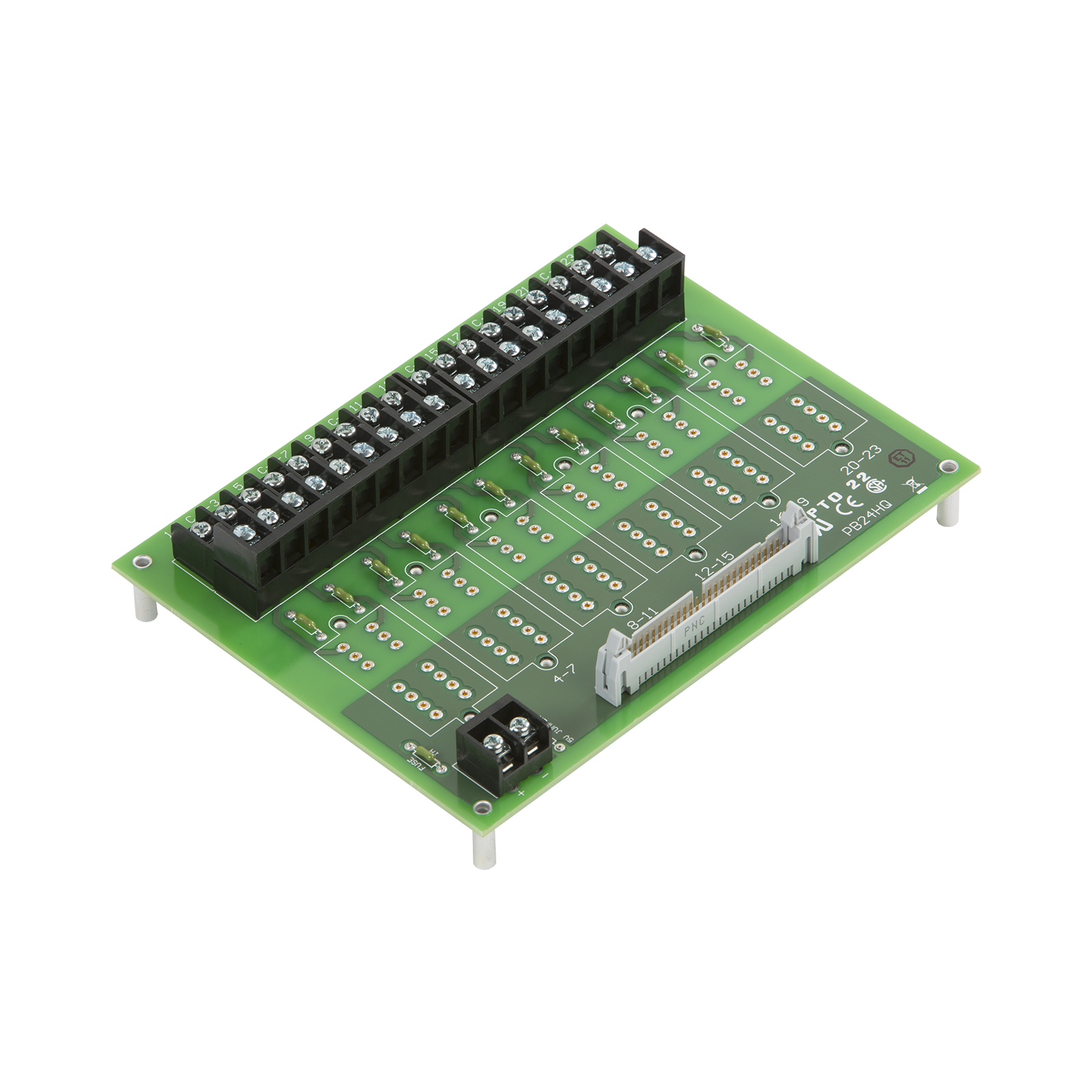 The PB24HQ I/O mounting rack can accommodate up to six Quad Pak I/O modules for a total of 24 I/O channels. This mounting rack uses a 50-pin male header connector for connection to computer parallel I/O ports via a 50-conductor ribbon cable.