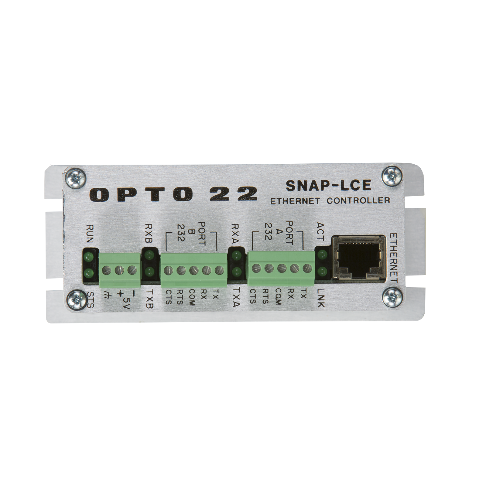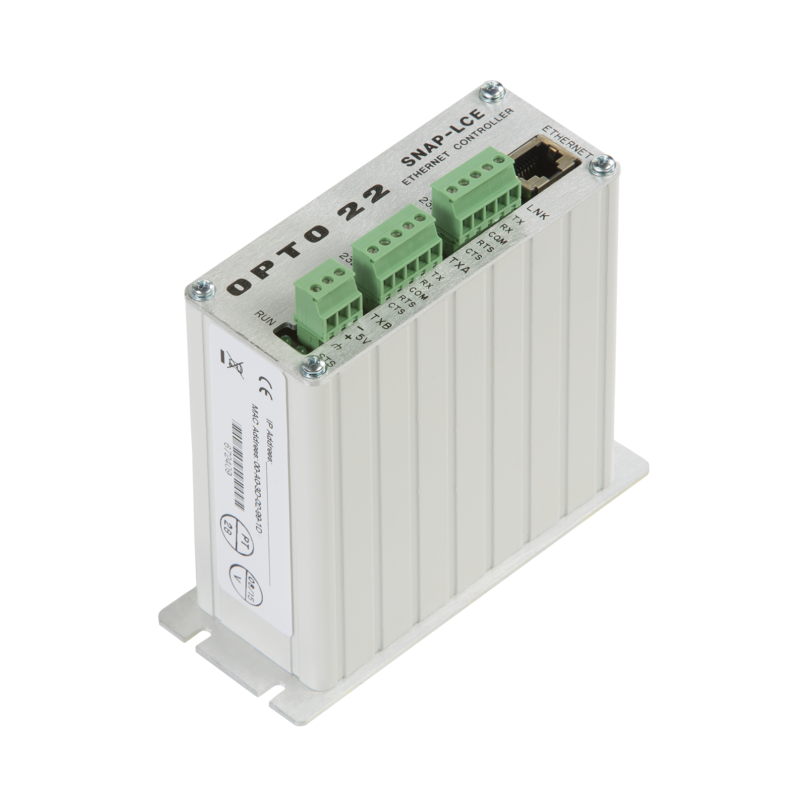 The SNAP-LCE, part of Opto 22's SNAP Ethernet Systems family, is a older, standalone, small-footprint, industrial controller designed for use with SNAP Ethernet-based I/O units and ioProject software. It is used primarily in industrial control applications. The SNAP-LCE provides real-time control and is programmed with the included ioControl, a flowchart-based control programming software. NOTE: The SNAP-LCE and ioProject are not recommended for new development. For new development, use a SNAP PAC controller and PAC Project software.