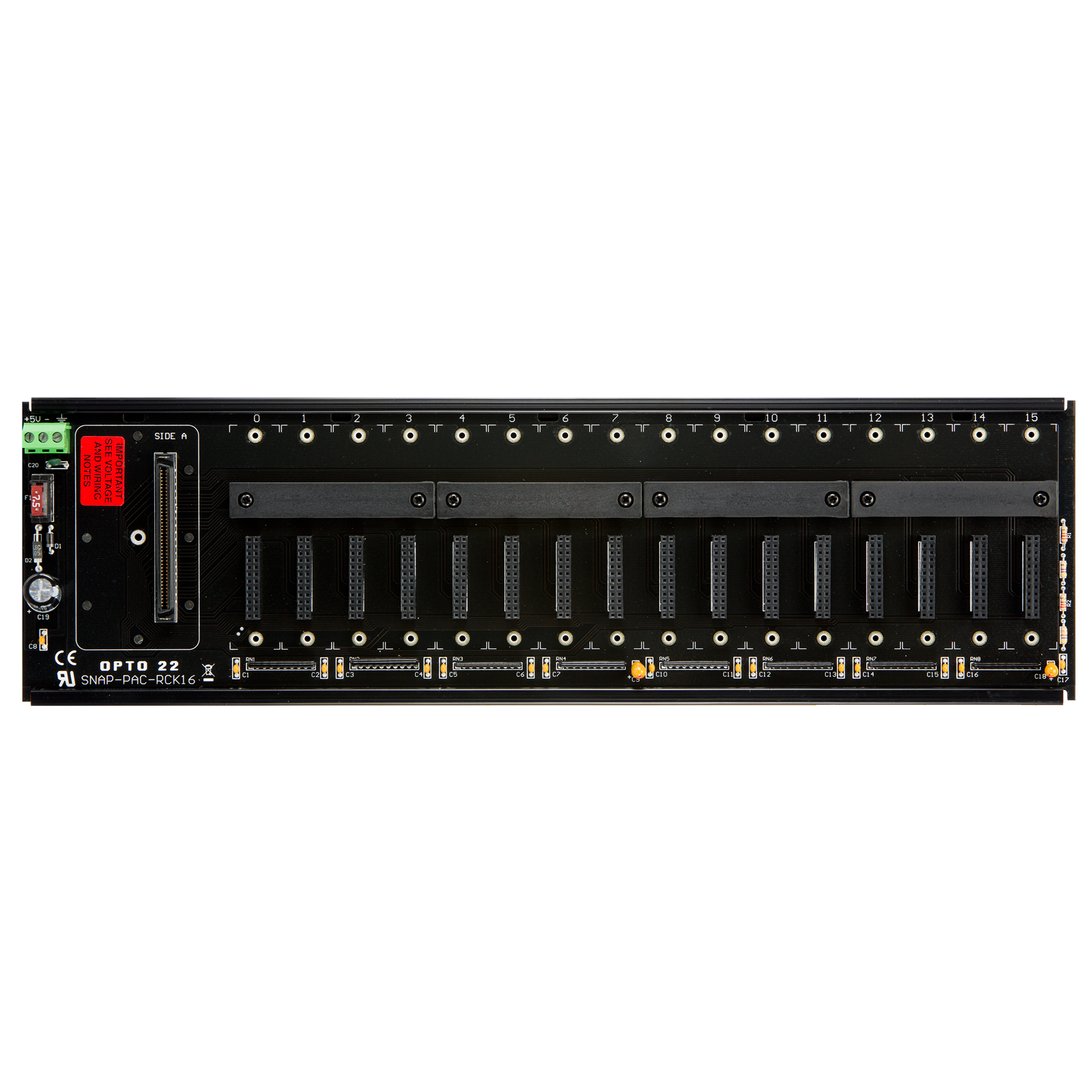 This rack works with all SNAP I/O modules on the Opto 22 website. Analog, digital, and serial modules can be mixed on the rack and placed in any position. (Some serial modules are limited to a maximum of eight on one rack. See module data sheets for limitations and power requirements.)