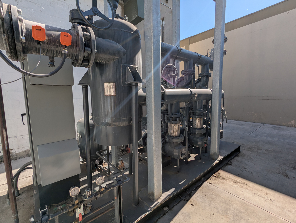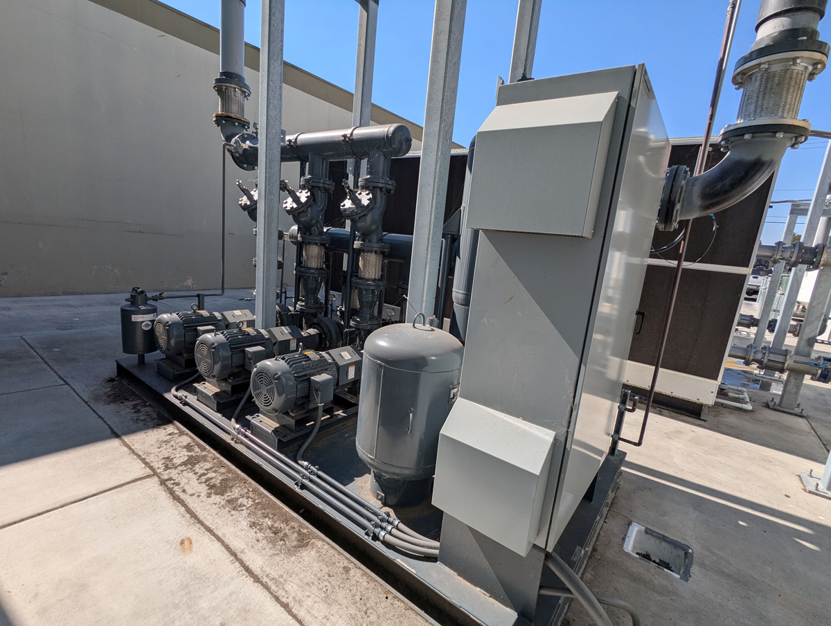 The pump station circulates cooled water through the HVAC loop.