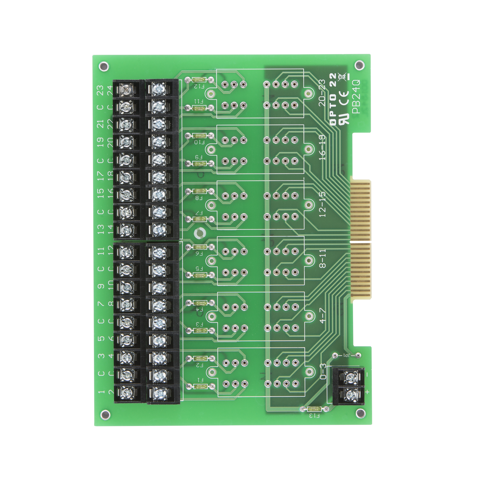 The PB24Q I/O mounting rack can accommodate up to six Quad Pak I/O modules for a total of 24 I/O channels. This mounting rack uses a 50-pin card edge connector for interface to computer parallel I/O ports via a 50-conductor ribbon cable. The mounting rack features a replaceable 5-amp fuse for each pair of I/O module positions.